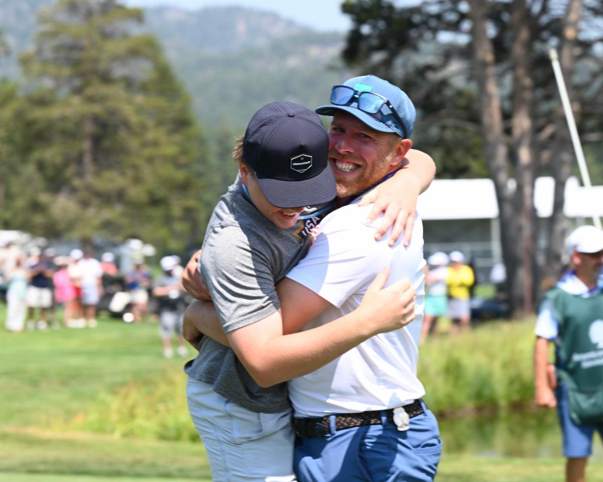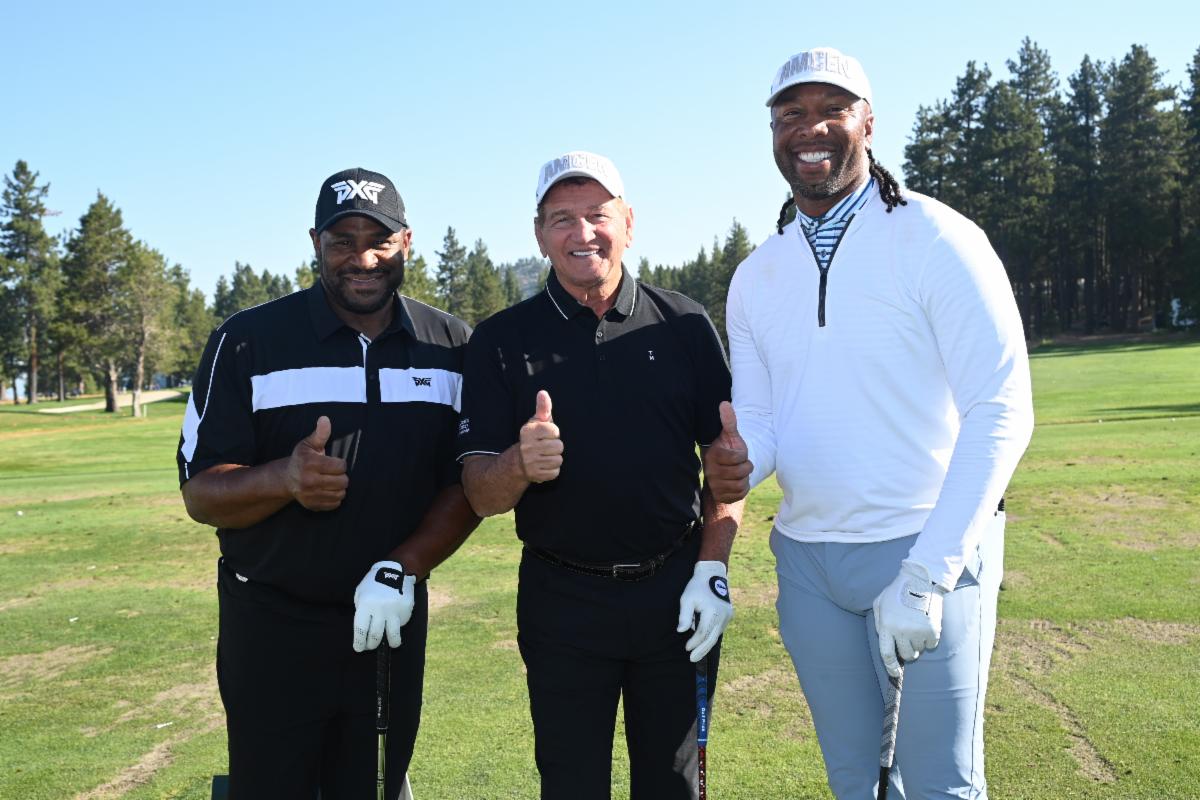 | Joe Pavelski hugs his son celebrating his win at The American Century Championship. Photo by Jeff Bayer. www.jeffbayerphotography.com | Joe Pavelski holds his trophy after winning the American Century Championship at Lake Tahoe. Photo by Jeff Bayer. www.jeffbayerphotography.com | Joe Montana was on the grounds during Friday’s round. Photo by Jeff Bayer. www.jeffbayerphotography.com | Steph Curry contemplates his putt on Saturday. Photo by Jeff Bayer. www.jeffbayerphotography.com | L-R: Jerome Bettis, Joe Theisman, Larry Fitzgerald. Bettis' sons are enrolling at Notre Dame University this fall. Photo by Jeff Bayer. www.jeffbayerphotography.com | Former 49er great Jerry Rice is always a fan favorite at the tournament. Photo by Jeff Bayer. www.jeffbayerphotography.com | Larry The Cable Guy is a barrel of golf laughs. Photo by Jeff Bayer. www.jeffbayerphotography.com | Kansas City Chiefs' tight end Travis Kelce tosses his ball to the crowd. Photo by Jeff Bayer. www.jeffbayerphotography.com | |