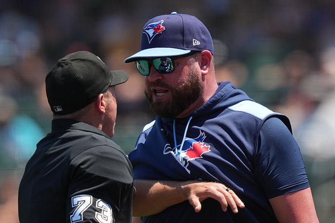 | Blue Jays manager John Schneider argues with home plate umpire Tripp Gibson (73) after being thrown out of the game during the fifth inning. Photo and caption by Darren Yamashita. | |