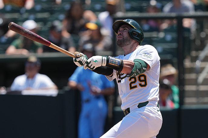 Athletics catcher Austin Wynns hits the first of a trio of two-run home runs by the home team as the A's completed the first half of the season with a 6-3 victory over the Toronto Blue Jays at Sutter Health Park on Sunday, July 13th. Photo and caption