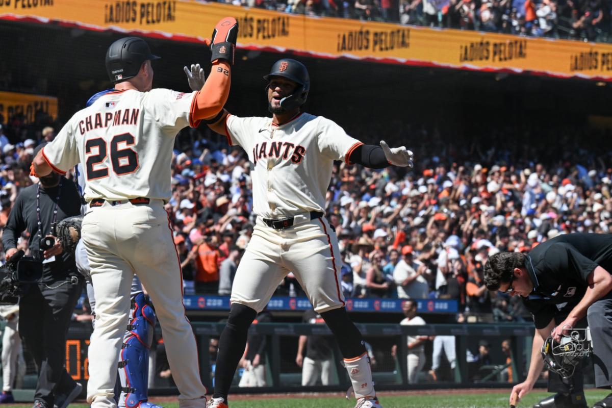 Matt Chapman greets Matos at home plate after his home run gave the Giants some temporary hope. Photo and