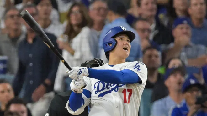 Shohei Ohtani with one of his three home runs against the Milwaukee Brewers on October 17 in Dodgers Stadium. Ohtani also pitched six innings, allowing two hits and striking out 10
