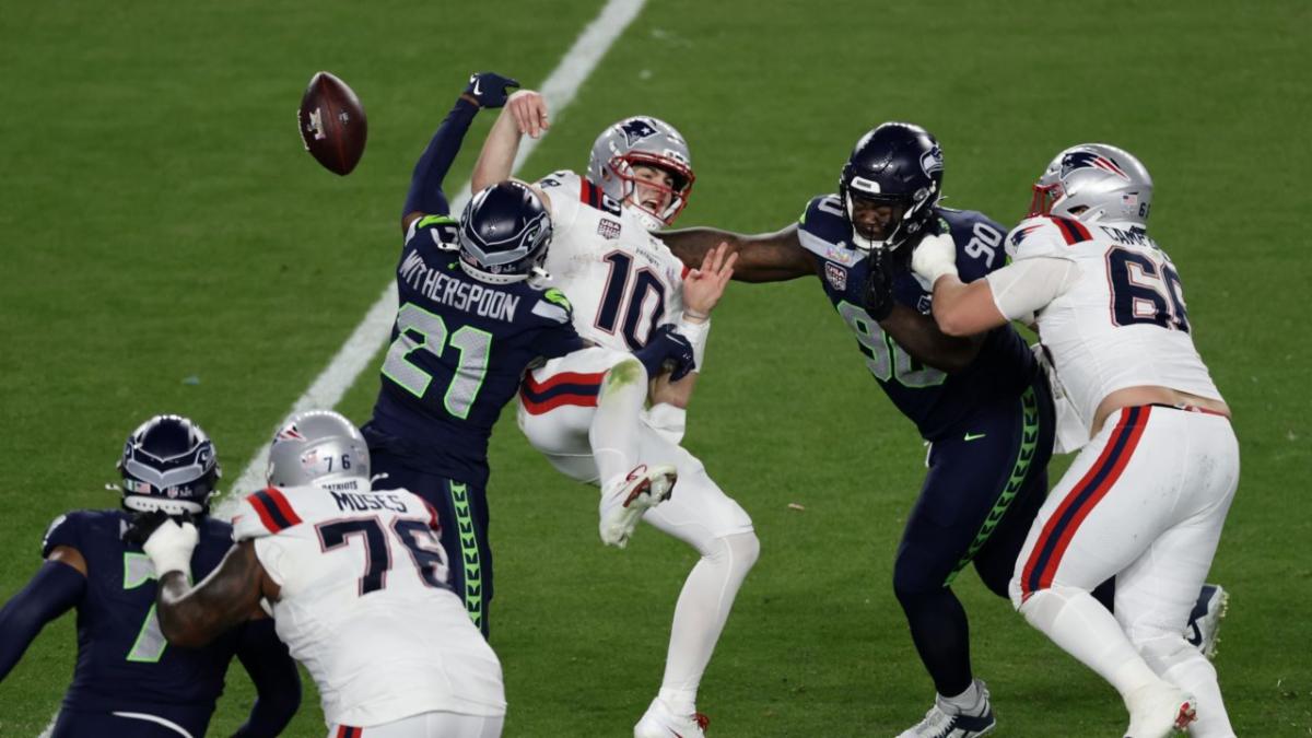 Drake Maye is sent sprawling by a relentless Seattle defense
