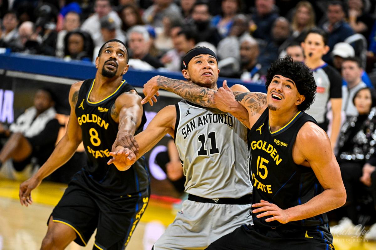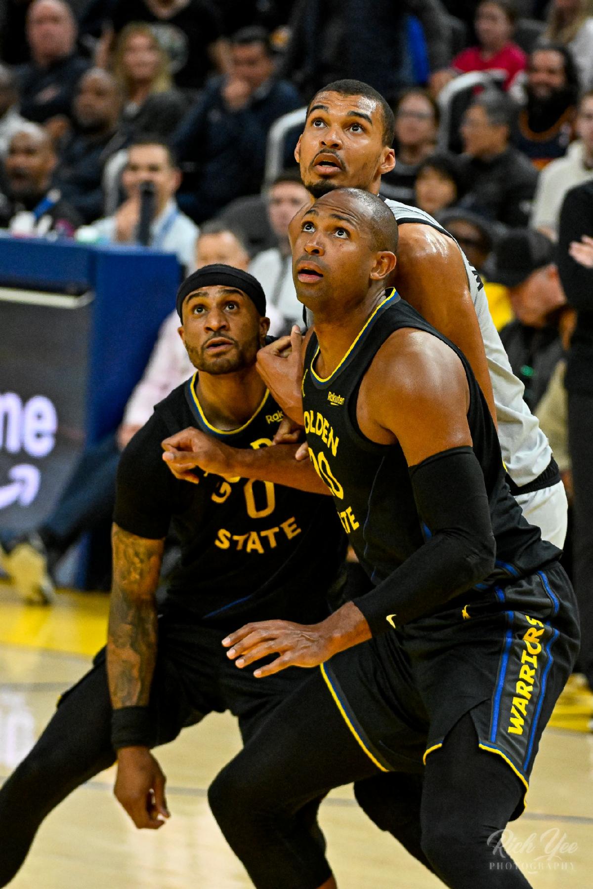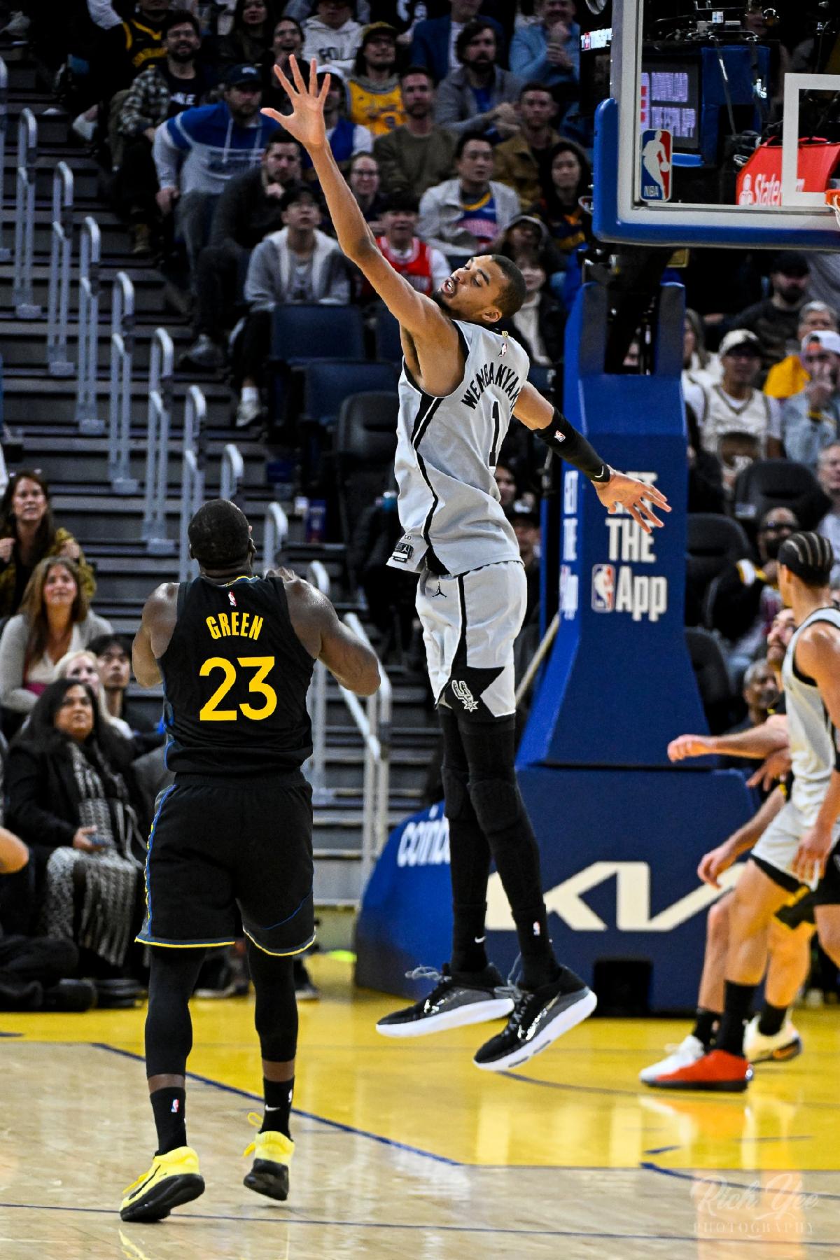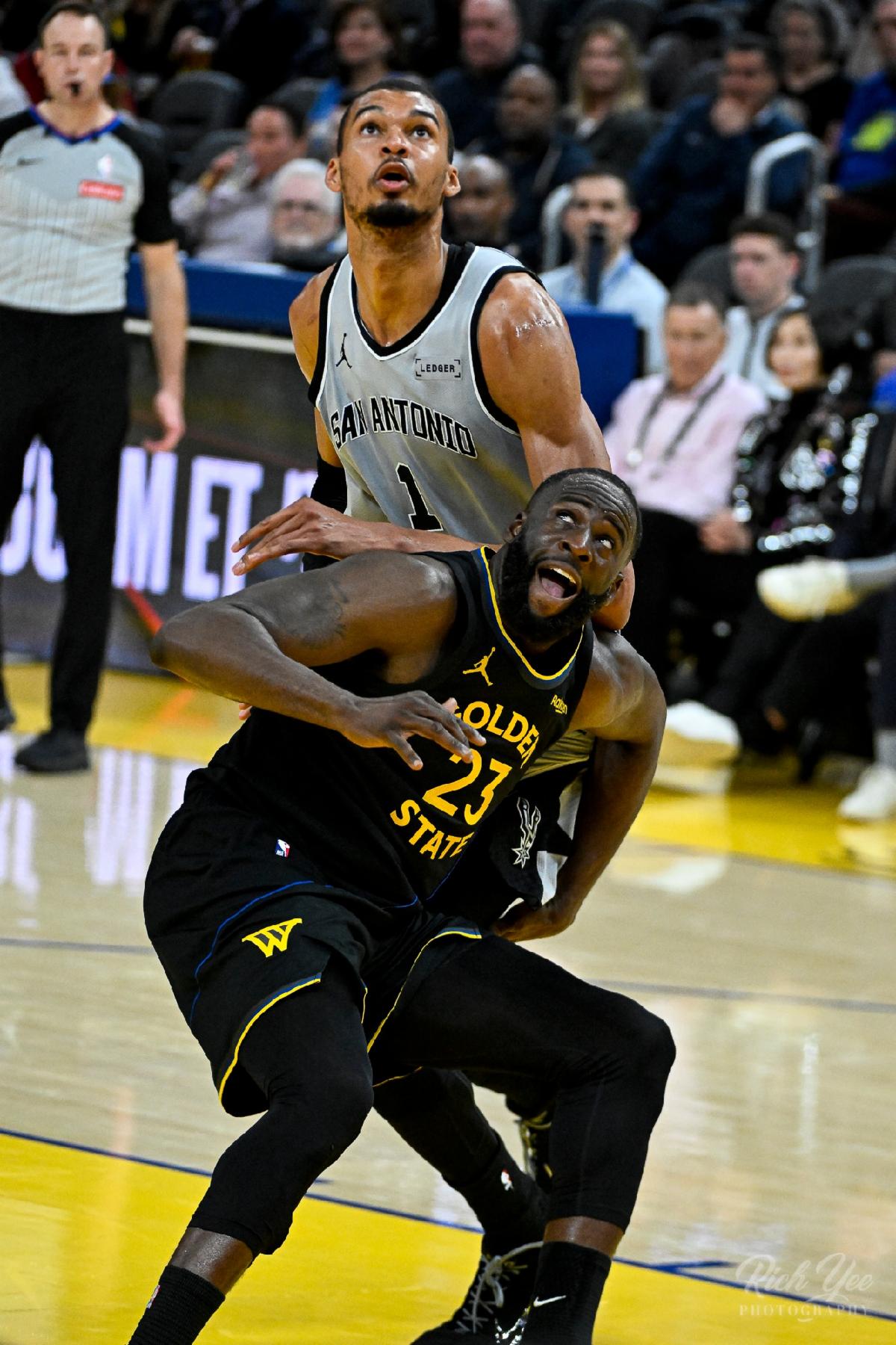 | | Draymond Green boxes out the Spurs' rising superstar Victor Wembanyama, who is nearly a foot taller. Photo by Rich Yee. | | | | |
