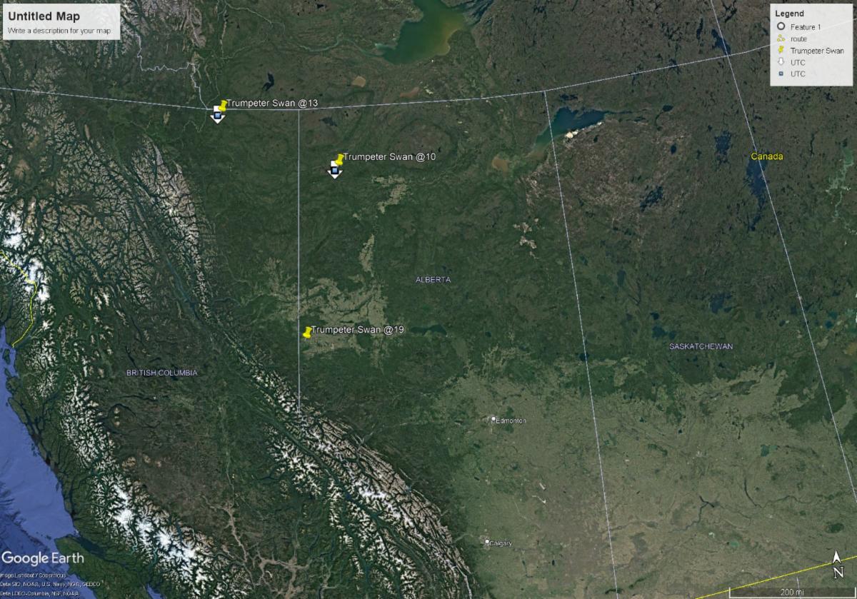 Only one of the GPS collars of the 12 trumpeter swans marked in the study transmitted data during the month of July. Adult female with collar code @10 remained very sedentary in the same area she used in June on a small wetland just northeast of the small town of Chateh in extreme northwestern Alberta. Her sedentary behavior suggests that she has been nesting and may have a brood. She should be molting her flight feathers at this time of year. Read More