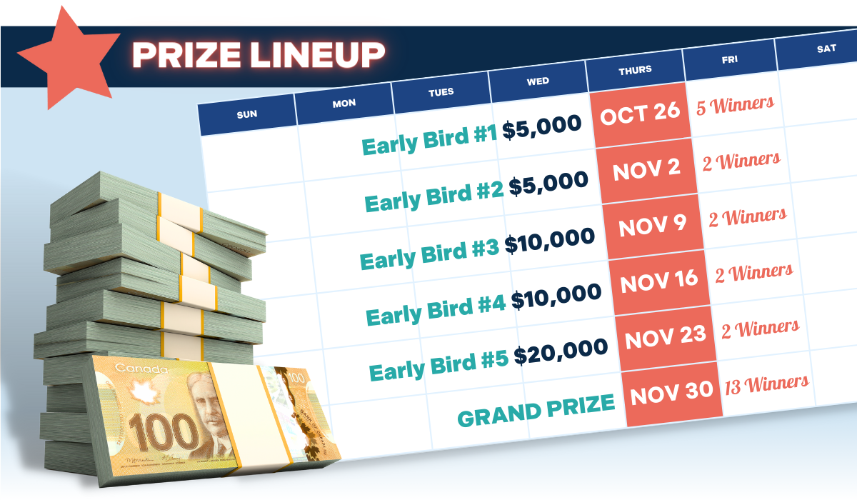 By getting your tickets now, you'll have a shot at winning $50,000 total in Early Bird prizes. Plus, don't forget about the ever-growing jackpot, which is now over $134,000!