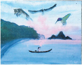 The mural pictured above is separate piece that depicts an indigenous person in a canoe with spirit animals around the person. This mural may also be painted, depending on space availability.
