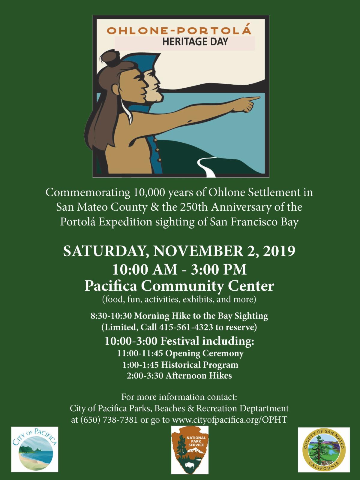 On November 2, 2019, the City of Pacifica, in partnership with San Mateo County, the National Park Service at the Golden Gate National Recreation Area, and other agencies, will commemorate “Ohlone-Portolá Heritage Day,” a story of two people -- the indigenous population and their culture, and the arrival of the Spanish colonists. It was on November 4, 1769, that S