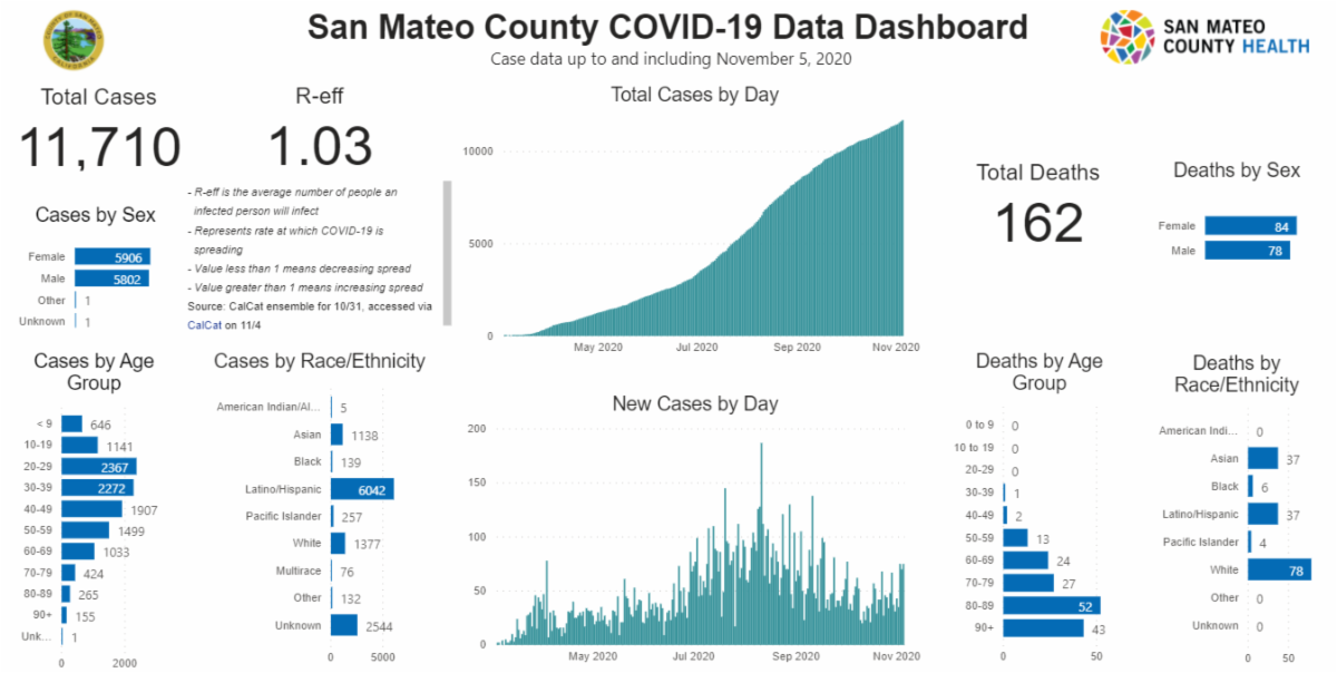 11-6-2020 - This dashboard details the number of COVID-19 cases and deaths within San Mateo County, including by day, age, race/ethnicity and sex of patients. A case is someone who tests positive for COVID-19 using viral testing performed in a lab.