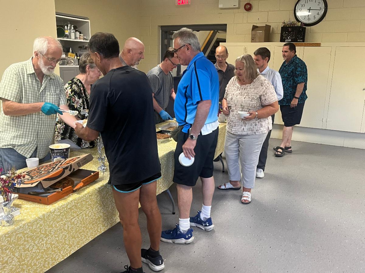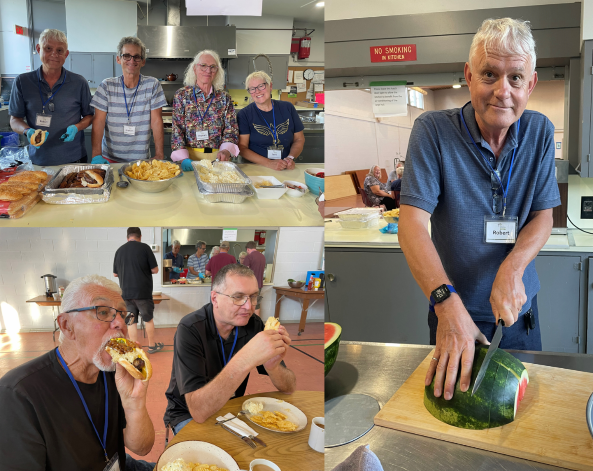 William served lasagna complemented by salad, green beans, and a selection of fruit and cakes.