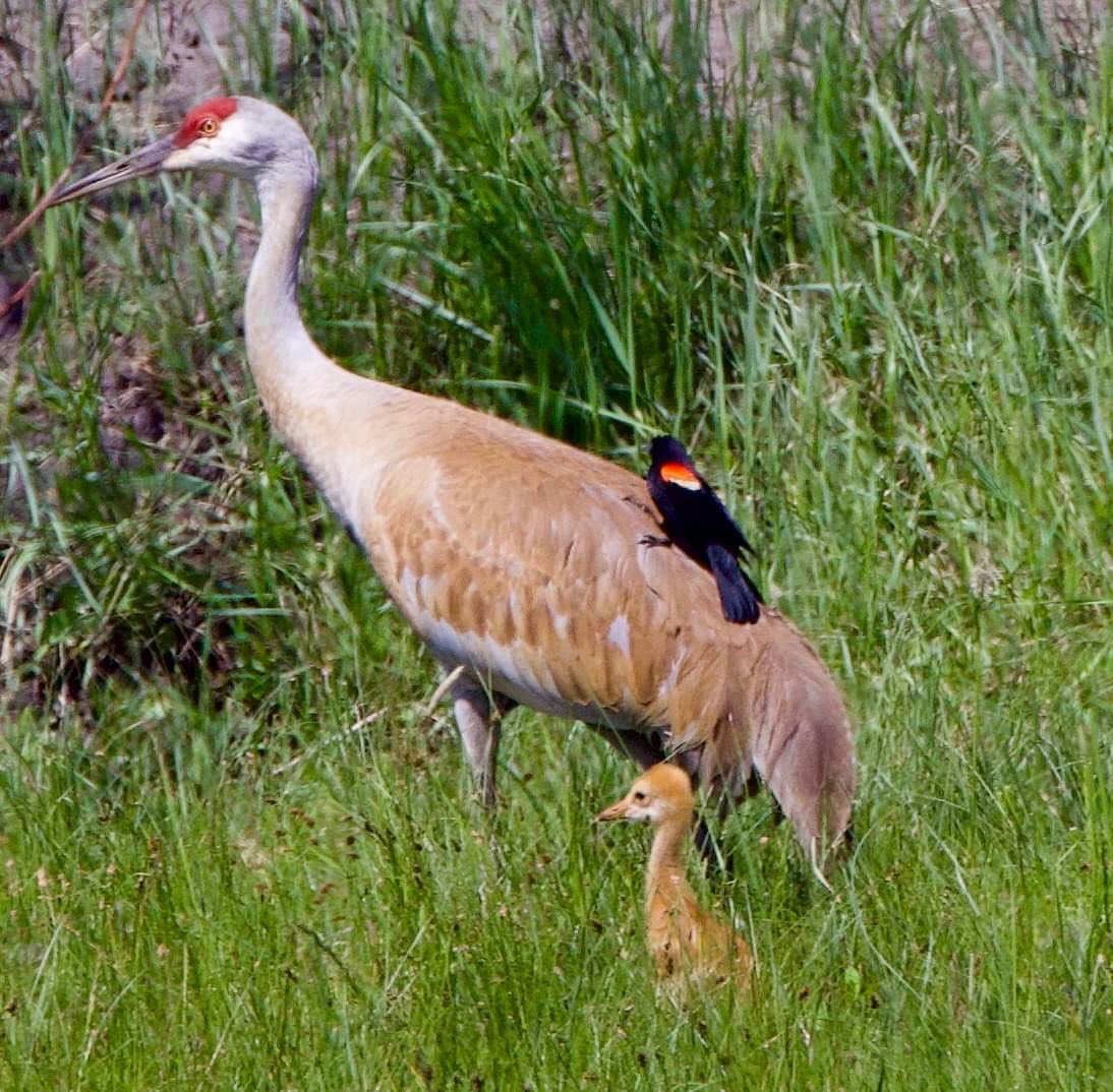 June 5, 2023: A red-winged blackbird photobombs the family portrait session of sandhill crane and colt. Photo by Beth Aften