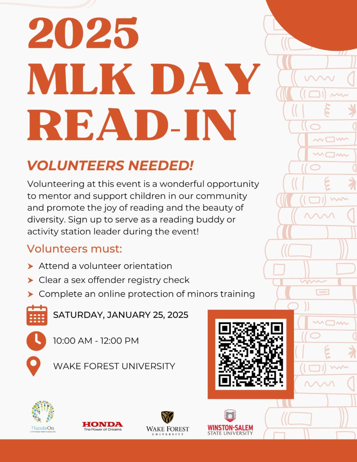 The Martin Luther King, Jr. National Day of Service promotes Dr. King's ideals of service, equality, and non-violence. For over a decade, we've honored his legacy with our annual Read-In Event, which will take place this year on Saturday, January 25, 2025, from 10 AM - Noon at Wake Forest University. The program is jointly organized with our partners at Wake Forest University and Winston-Salem State University, as well as HandsOn NWNC. The event this year is generous sponsored by Honda Aerospace.