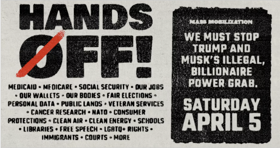 Indivisible has organized a "Hands Off" protest scheduled Saturday, April 5.