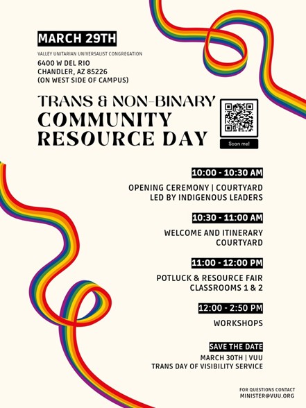 Join us as we learn with each other about the journeys of transgender/non binary folx and those who love them while amplifying their calls to action and solidarity. We will hear from Tami Staas, Executive Director of Arizona Trans Youth and Parent Organization (AZTYPO); Magnus Hawthorne, VUU Member; and Jozeppi Angelo Morelli, featured in “Authentic Selves: Celebrating Tran and Nonbinary People and Their Families.” (This is the UUA Common Read this year and is published by Beacon Press.)