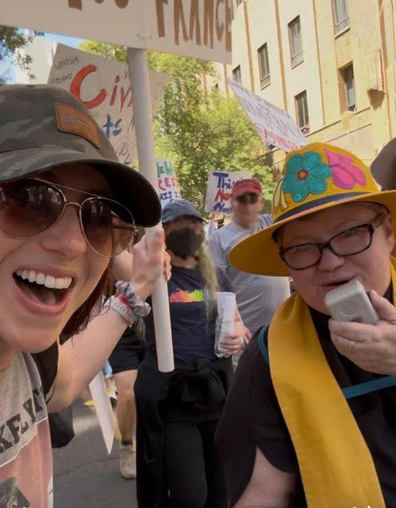 Bring protest signs with large “No Kings!” letters! We will have 3 large “No Kings in America!” flags to carry, too.