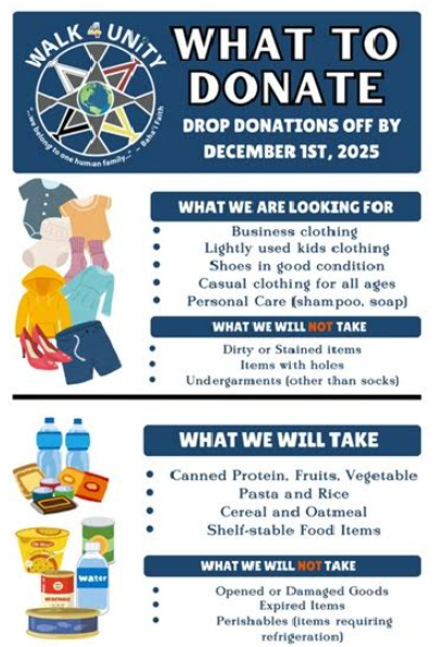Chandler4Change, a diversity and inclusion action group, is planning a Walk4Unity December 7. They have asked VUU and other organizations to donate gently used clothing and nonperishable food to be respectfully given to those in the community in need.