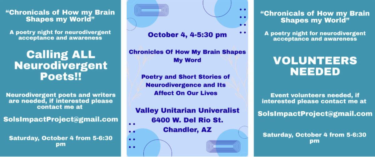 October 4, 4-5:30p. “Chronicles Of How My Brain Shapes My World” is a poetry/short stories event that celebrates the beauty of neurodivergence while also acknowledging the struggles that come from living in a world shaped to fit neurotypical minds. We are looking for a collection of poets and storytellers from different walks in life who are willing to share their stories with others. The first step in change comes from those who aren’t afraid to speak up for themselves and their community. We hope that this event will bring unite the community together and remind us that even in the darkest times, light can still be found in each other. Email Sol with your submission.
