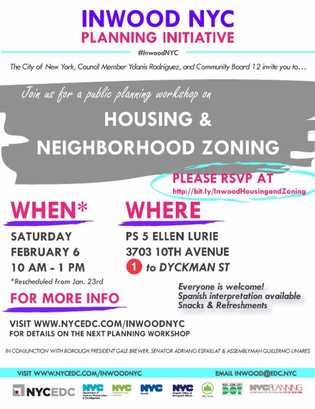will include similar information and activities on housing and zoning from previous workshops to ensure that we gather input from as many Inwood community members as possible on these important topics.