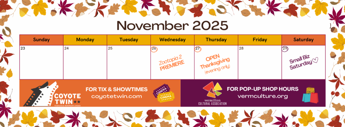 As a little bit of a heads up, we know change is coming to the VCA/Coyote Twin in 2026. In our new role as arts council, we have some growing to do. As a local nonprofit (but not "no profit") theater, we have some rethinking of our business plan to do. So we're going to spend some time on either side of the solstice making plans to share with you in the new year.
