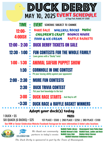 Vision of Wallkill and Wallkill Senior Celebration Committee will host their 4th Duck Derby on the Wallkill River on Saturday, May 10. Activities start at noon. Race starts at 3 pm.