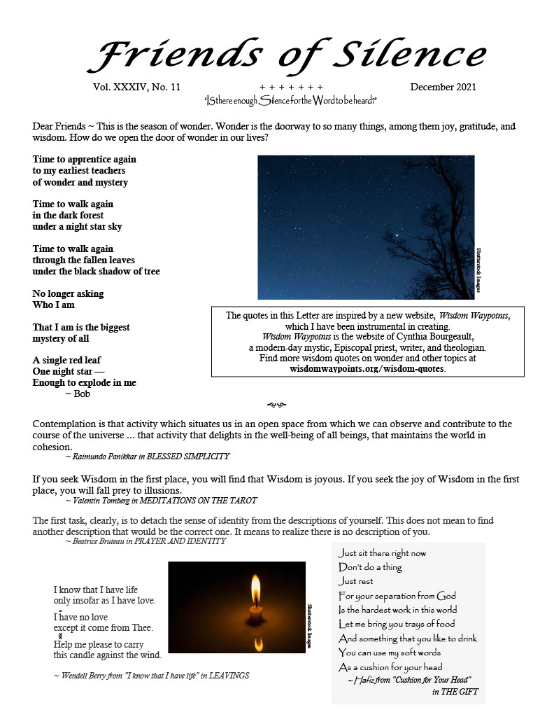 The monthly Friends of Silence Letter is sent free to thousands worldwide both in print and via email. Please consider donating this year to keep its wisdom and encouragement coming to you and to all. Click on the donate button above to give whatever you can. Thank you.
