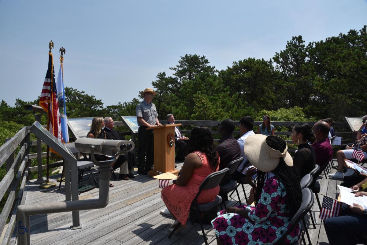 On July 13, Cape Cod National Seashore was honored to host a Citizenship Naturalization Ceremony at the Province Lands Visitor Center. Twenty-three people from 16 nations (from Jamaica to Turkmenistan) became United States citizens before Magistrate Judge Niedermeier, surrounded by friends and family. Special thanks to park employees John “Dig” Roberts and Dana Ayers for providing their musical talent. Even the whales and a bald eagle made an appearance!