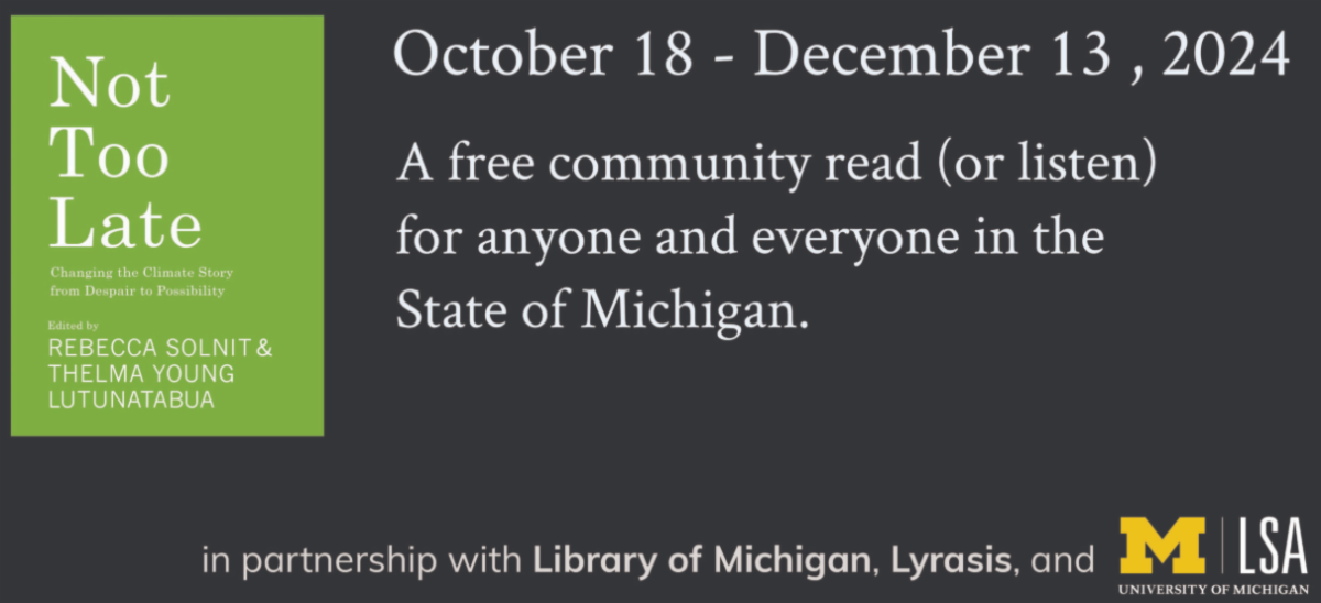 Now through December 13th, anyone in the State of Michigan with access to the internet can access Not Too Late: Changing the Climate Story from Despair to Possibility edited by Rebecca Solnit and Thelma Young Lutunatabua. The book offers a wide range of perspectives from a variety of communities from around the world, who all have in common an unwillingness to accept prewritten narratives of climate despair. Access the book here. Light refreshments and further resources will be provided. U-M Literature, Science and the Arts Building, Room 1040. 500 S. State St. Free. Click here to register.