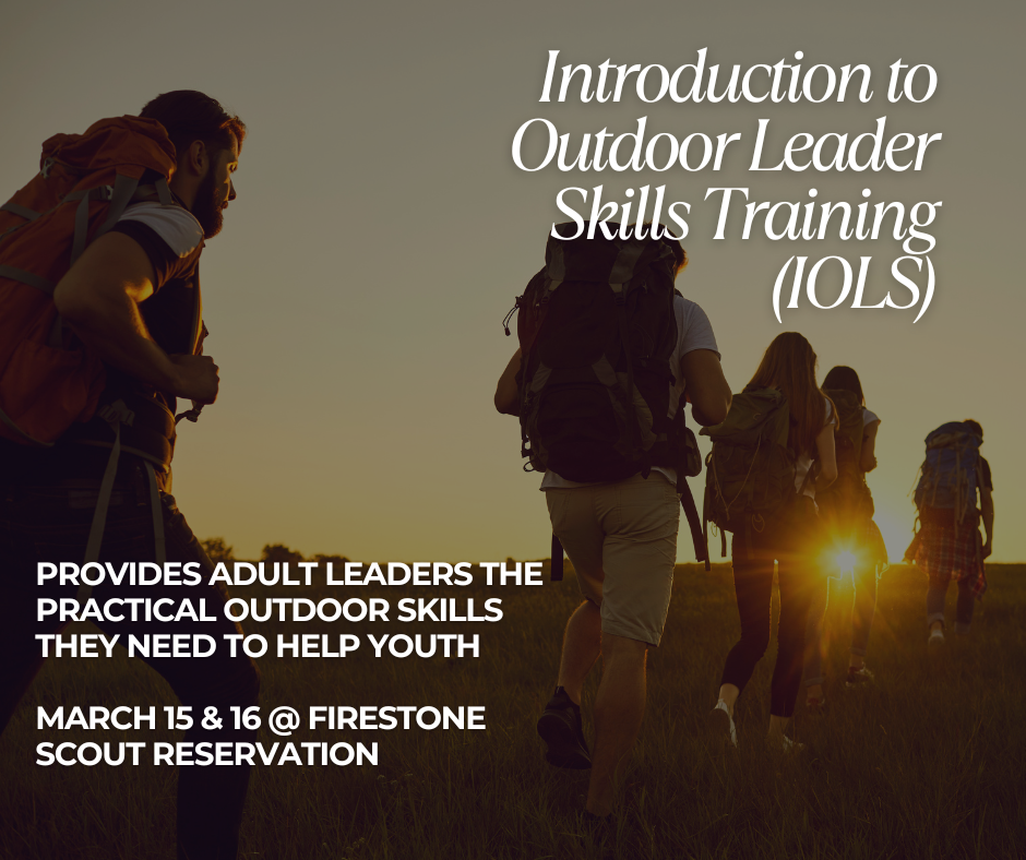 Join us for IOLS Training at Firestone Scout Reservation. This hands-on course provides essential outdoor skills to help Scouts advance to First Class and enhance your Troop leadership.