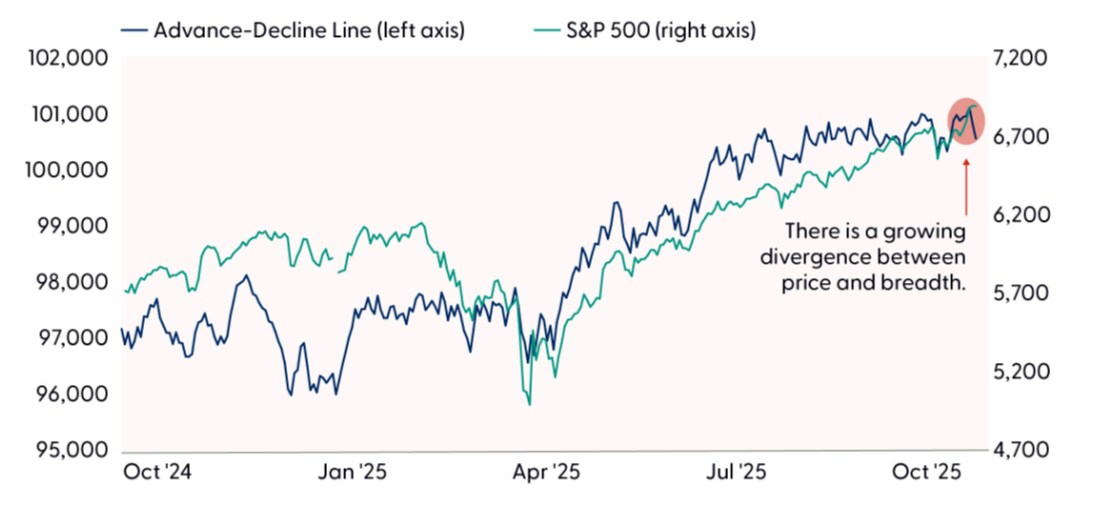 In sum, the macro backdrop is evolving: monetary policy is less predictable, trade risks are easing, and earnings are surprising to the upside. But concentrated leadership and structural cracks in market breadth suggest a more selective and tactical approach may be warranted heading into year-end.