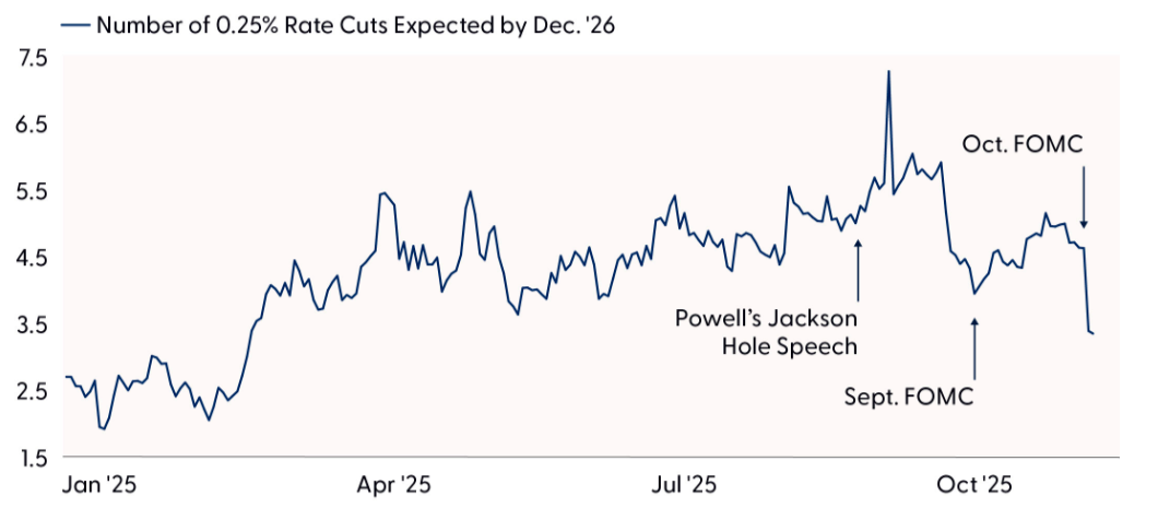 The October FOMC meeting delivered the widely expected 0.25% rate cut, but the tone was notably less dovish than markets anticipated. While the Fed acknowledged rising risks to the labor market and ended QT earlier than planned, Chair Powell’s comments introduced uncertainty around future rate cuts. The lack of clear forward guidance, combined with growing dissent among policymakers, has reduced visibility and increased volatility risk. Treasury yields rose, stocks pulled back, and rate cut expectations were repriced lower, reflecting a more cautious stance from investors.