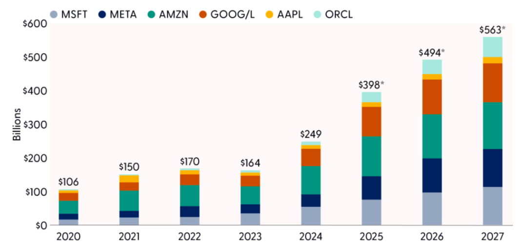 The S&P 500 is over halfway through Q3 earnings season, and results have been impressive. Of the 318 companies that have reported results, 83% have surpassed earnings per share (EPS) estimates, notably above the 10-year average beat rate of 75%, according to FactSet. Growth has been supported by strong margins, which are running close to 13% this quarter. However, most of the attention last week was on capital expenditures (capex) reported by several of the mega cap stocks. Among these names, including Alphabet (GOOG/L), Amazon (AMZN), Apple (AAPL) Meta (META), and Microsoft (MSFT), the message of more spending on artificial intelligence (AI) infrastructure was clear as they collectively spent over $100 billion on capex in Q3. This number is only going to go up, based on guidance to increase spending on AI-related investments. As highlighted in the “Capital Expenditures Surge Across Big Tech” chart, capex among many of the mega cap names is expected to jump from around $400 billion in 2025 to $563 billion by 2027.