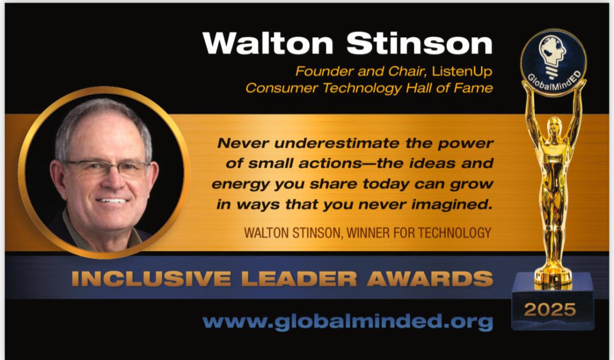 Today, we celebrate Walt Stinson, Co-Founder and CEO of ListenUp, and the GlobalMindED Exceptional Leader Award winner in Technology. Stinson has spent over 50 years building a legacy of innovation in the consumer electronics and home entertainment industry, shaping the way people experience music, film, and technology in their homes. He is a Fellow of the World Academy of Art and Science, co-Founder of the UN Initiative, Human Security for All (HS4A) and was the winner of the CES (Computer Electronics Show) prestigious Lifetime Achievement Award.
