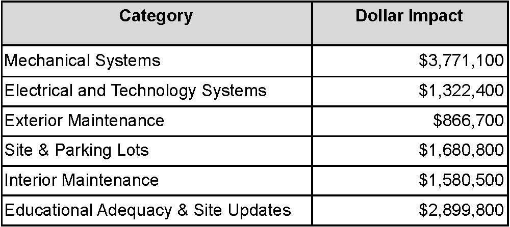 Grand totally NEXUS solutions identified nearly $22 million in current and future needs. However, this number was quickly and significantly reduced to $12.1 million. Several items such as roofing do not need immediate attention, but will remain on the District’s radar for long term planning.