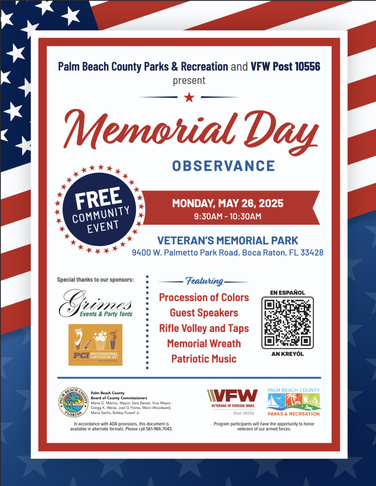 | | Looking for Fun This Memorial Day? | | Join PBC Commissioner Maria Sachs and honored military-service members from the local Veterans of Foreign Wars (VFW) Post 10556 for a Memorial-Day extravaganza at Veterans Memorial Park! | |