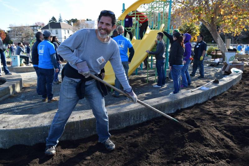Oakland Parks Foundation Executive Director, Ken Lupoff gets out of the office, and gets to work helping to build a new playground!