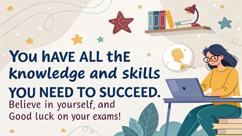 SkyHawks: Good luck on your finals! You have all the knowledge and skills you need to succeed. Believe in yourself! Stay calm and confident!