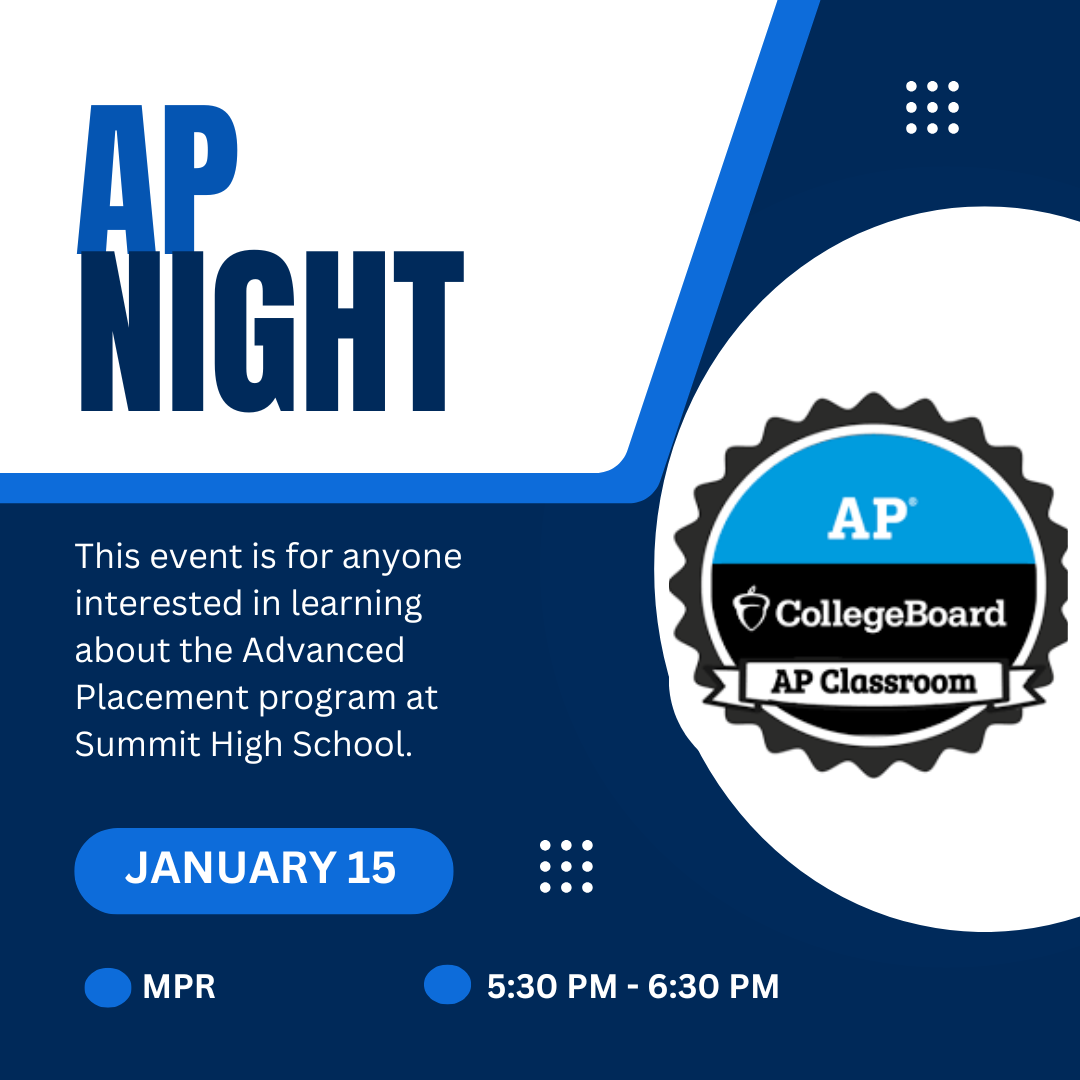 AP Night: Save the date for our AP Night that will be held on January 15th at 5:30 PM in the MPR. This event is for anyone interested in learning about the Advanced Placement program at Summit.
