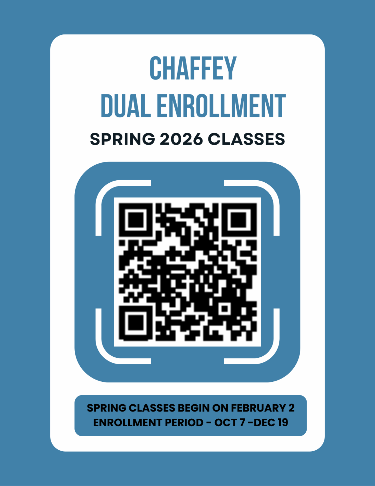Chaffey Dual Enrollment: Registration for Spring 2026 courses closes on December 19, 2025. Visit the liktree for more info: https://linktr.ee/Dual_Enrollment. See Mr. Preciado in Rm. F110 (6th period ONLY) or Ms. Tedder in the Library for questions.