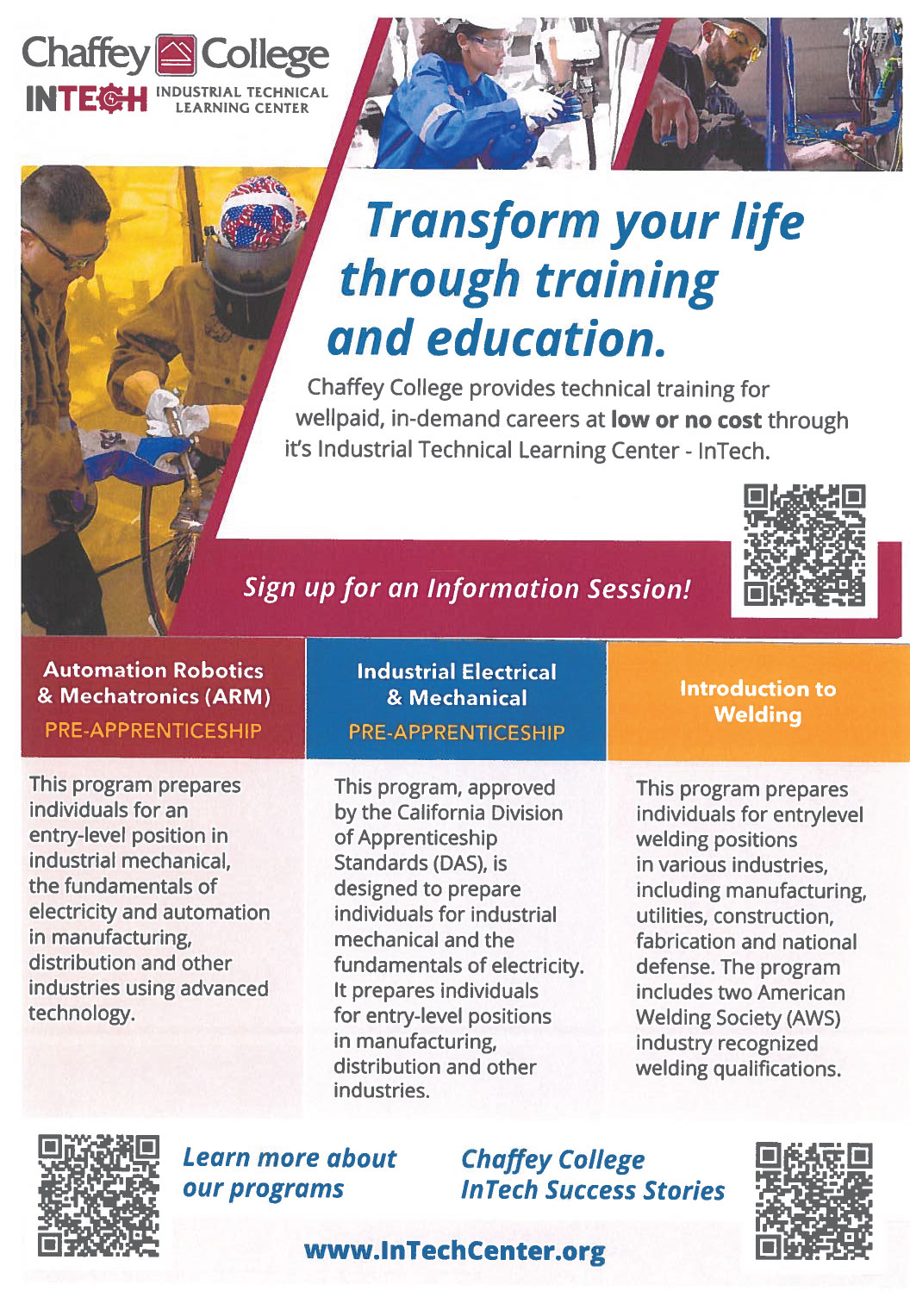 Interested in pre-apprenticeship programs at Chaffey College? Chaffey College provides technical training for well paid, in-demand careers at low or no cost through the In-Tech Center located in Fontana. Scan the QR codes (see flyer) to learn more about their programs!