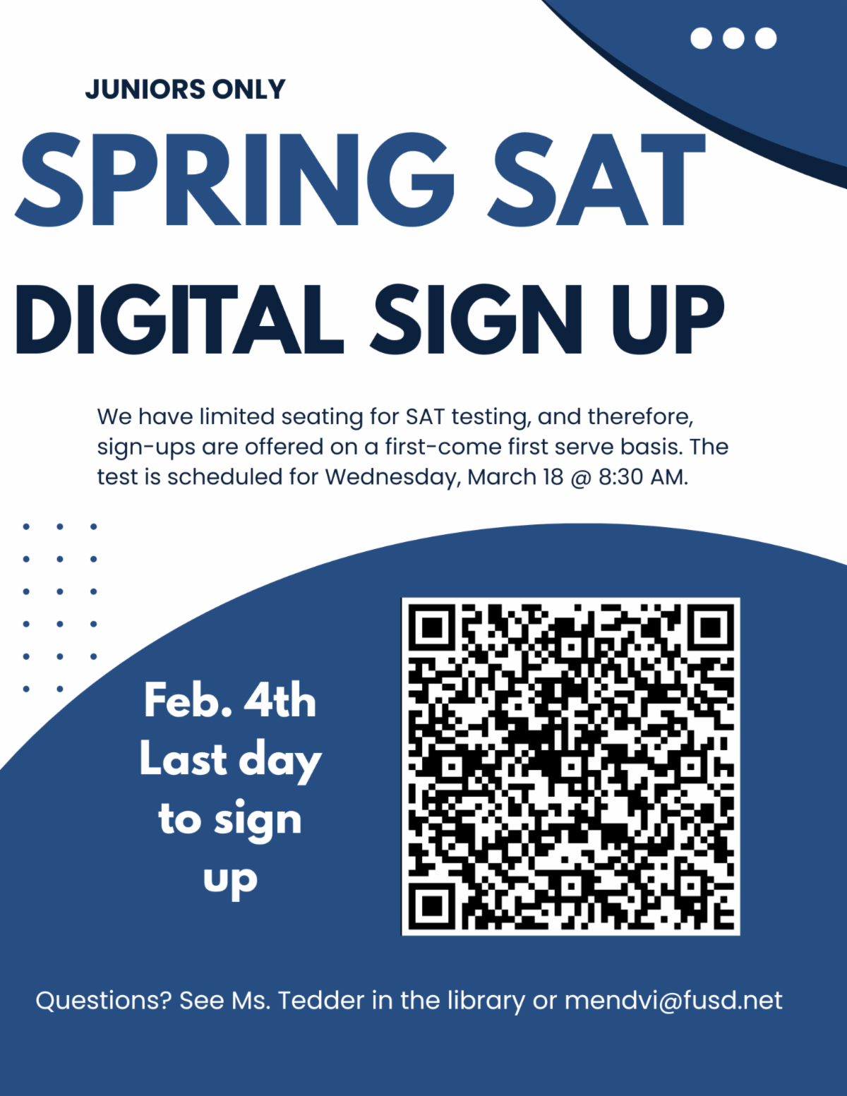 Juniors Only: Spring SAT (March 18th) sign up QR code is now available on the library door. Sign-ups close on Feb 4th.