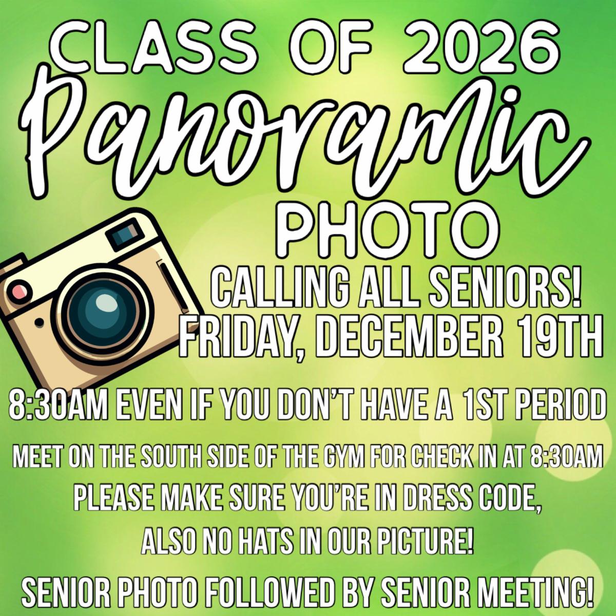 Senior Activities: This Friday, seniors will take their Class of 2026 Panoramic Photo. Meet at the south side of the Gym at 8:30 AM. Be on time, make sure you're in dress code and no hats. We will also be having an important senior meeting during this time and hosting our annual senior dodgeball tournament! You don't want to miss it!