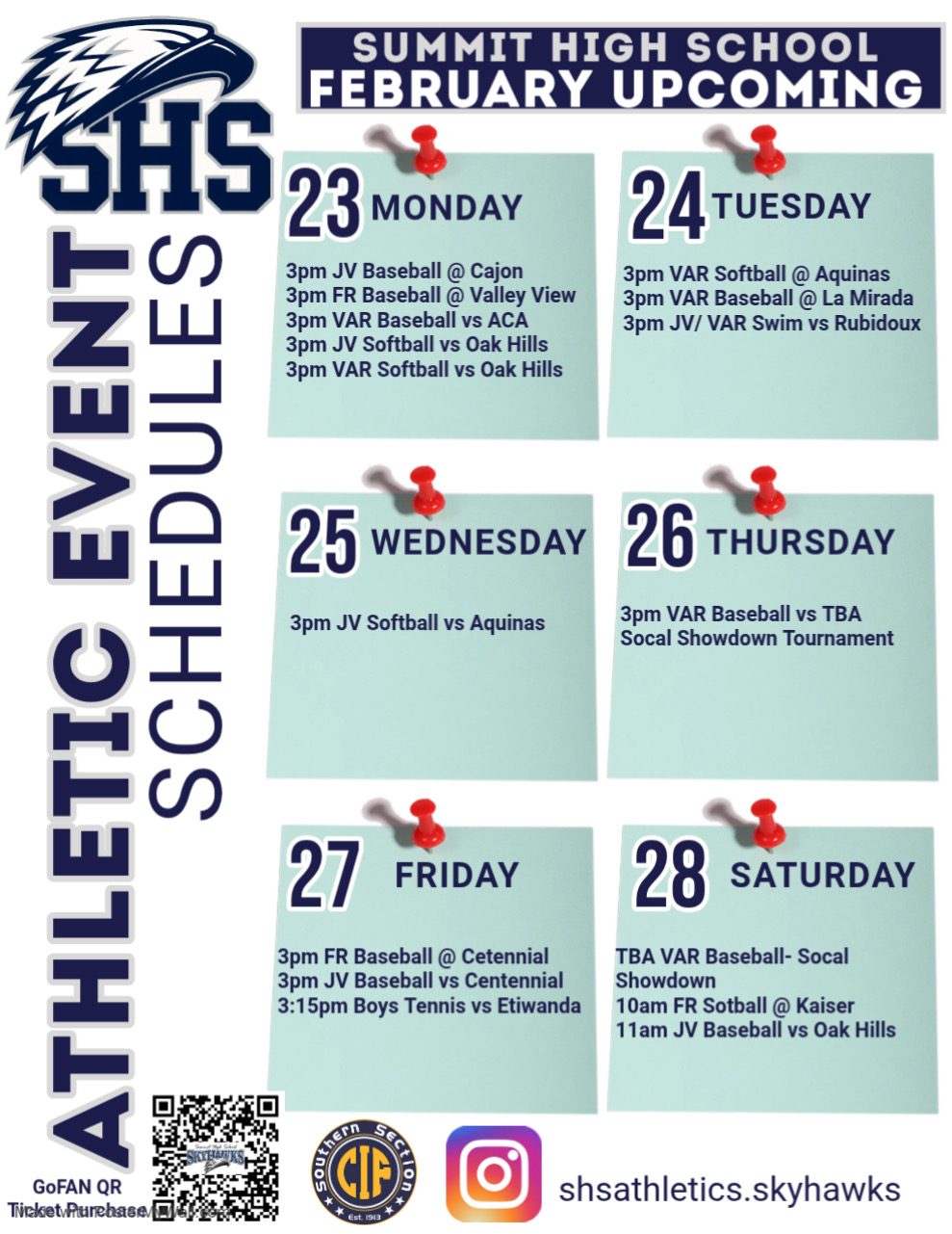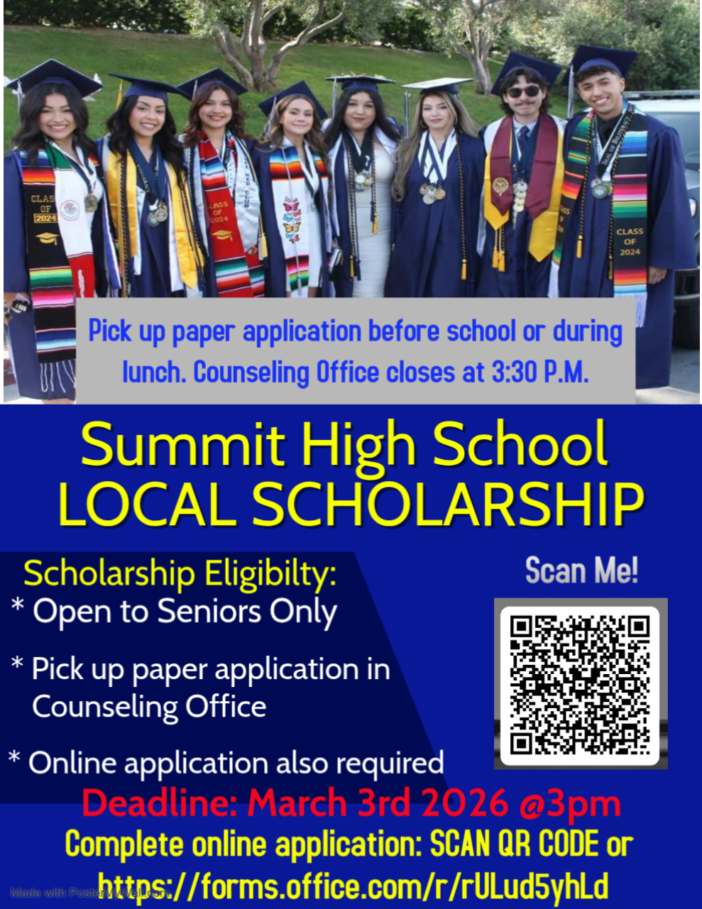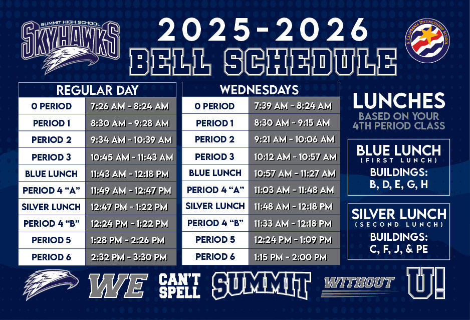 Parking: All cars in both parking lots must display Summit parking permits. Please see ASB Bookkeeper, Magaly for application. Permits are available at no cost. No student parking in the SOUTH PARKING LOT. The student parking lot is open until 2nd period for students with no first period. Warning stickers and citations will be issued soon in both parking lots.