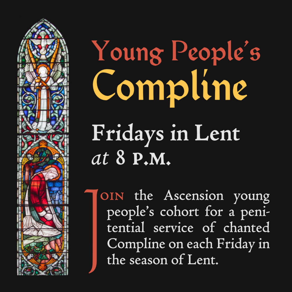 As we continue our journey through these great forty days, the Ascension young people’s cohort will be offering a weekly chanted service of Compline in the church each Friday of Lent at 8 p.m. During this season of examination and renewal, we hope that you can take a respite from the demands of work or studies to join us and repose upon the Lord in this evening office. No prior chant experience is necessary.