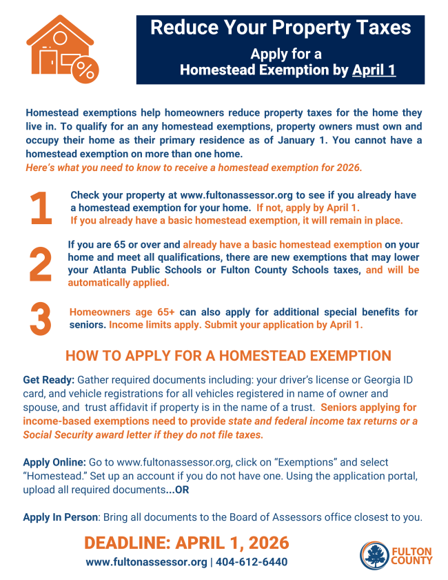 The deadline to apply for a homestead exemption is April 1, 2026. Applications may be submitted either online or in person.