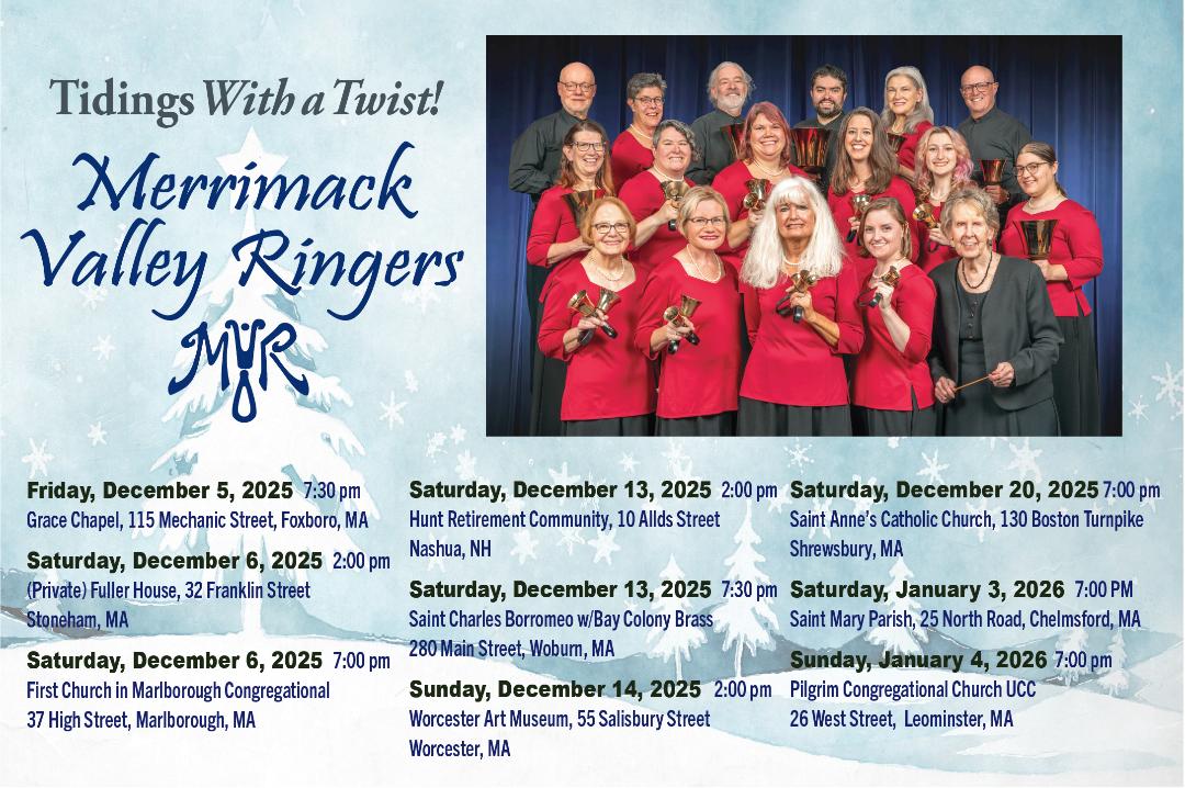 I hope this message finds you in good health, happily ringing, or listening to all the wonderful music happening in rehearsals and performances. As we enter into our busy season of sharing music, I hope you can make it to the many area performances and events! I am very much looking forward to the Winter Workshop on January 30th and 31st held at UMASS. With three ringing tracks this year, it is shaping up to be a wonderful weekend!