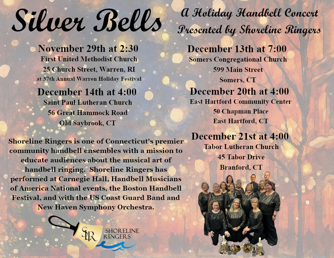 A new Rhode Island Community Handbell Choir has been established! We are known as the Lil’ Rhody Ringers. We rehearse every other week at Slatersville Congregational Church in North Smithfield, RI. We will be performing on December 17th at Milford High School, Milford, MA and on December 21st at a private holiday party in Jamestown, RI.