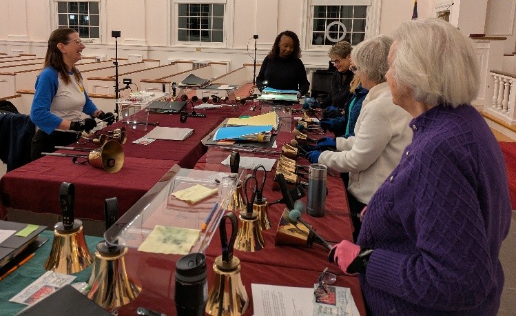 What a busy time of year as the holiday season rushes in. In the last two months, we kicked off our Travelling Clinic at two different locations. First, in early October, we went to Easthampton Congregational Church for an hour of handbell techniques and notation. From echoes and tower swings to mallets and marts, it was a great night of exploration for this new group of ringers. Many of the techniques they had not encountered yet. Emphasis was on recognizing the notation and executing the techniques correctly, musically, and safely – for both the ringer and the bells. Then in November, we took the clinic to Wilbraham United Church. There, for an hour, we taught the foundations and beyond for malleting and four-in-hand. A few ringers in the group had basic experience on both techniques, but with instruction and guidance from Lisa Arnold, they were able to finetune those skills, squash a few emerging bad habits, and grow as ringers. This one-on-one, hands-on class gave the ringers an opportunity to ask all those nagging questions and a chance to dig deeper into little nuances to make them better ringers.