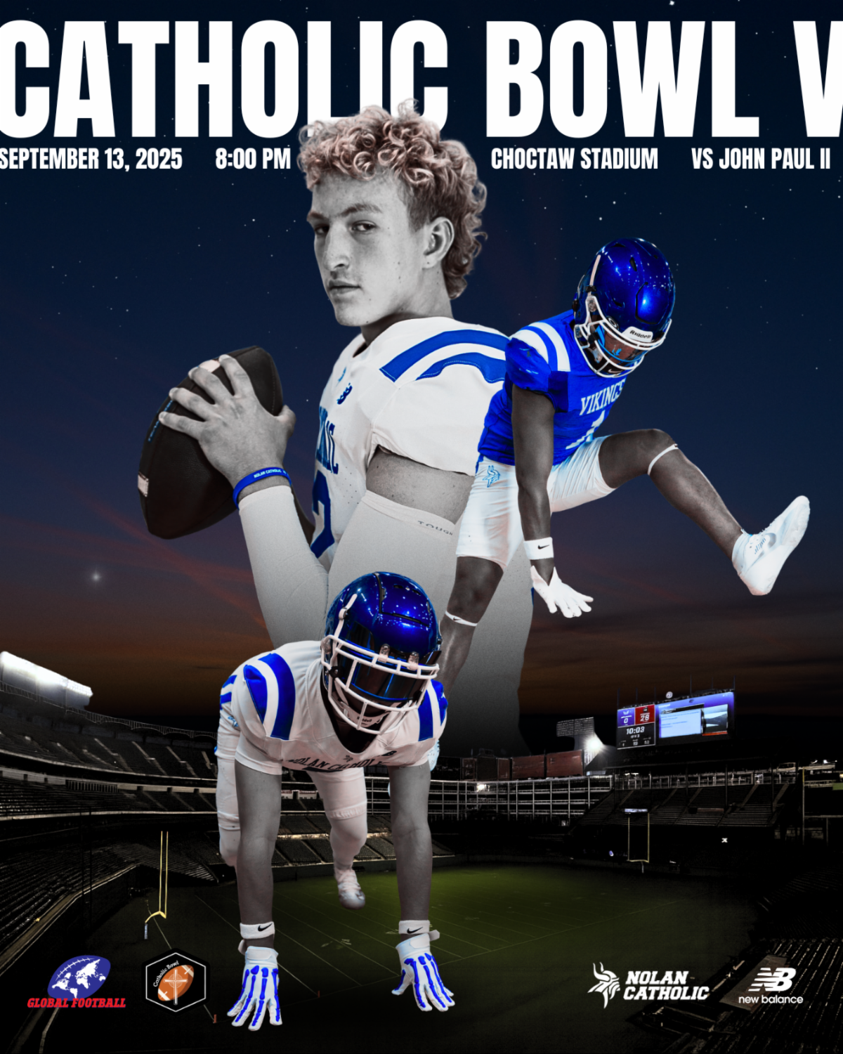 We are just under a month away from Catholic Bowl V in Arlington, Texas! Join us on Saturday, September 13, 2025, at 8:00 PM at Choctaw Stadium as your Nolan Catholic Vikings take on John Paul II.