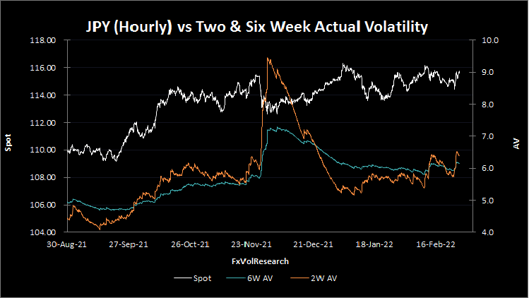 While not showing up as a "buy" on our percentile rank model, the short-dated CHF implied vols do look attractive both on a relative value basis (compared to other FX pairs in our database) but also on the basis of IV-AV spreads. The market is assuming that USDCHF vol will be damped down by movements in EURCHF and this may well be true on further EURCHF sell-offs but it is unlikely to be the case should EURCHF find a meaningful bottom. This has two implications. First, if you are a good to confident delta hedger the short dates look attractive, and second, if we do start to see a credible bottom in EURCHF then USDCHF should start to move higher. The other opportunity we will look for (at the moment we do not have enough evidence to support this) would be to structure a longer-dated EURCHF Condor structured to the upside. This is a trade for another day in our view but now, it is an idea that should be noted and filed for review once we get confirmation from other signals.