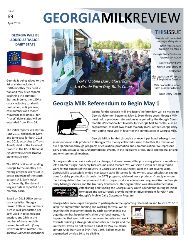 This month's report covers GA Milk Referendum next month, results of ACCM referendum, Eberly Family Farm award, Georgia legislative session and the April Dixie Dairy Report.