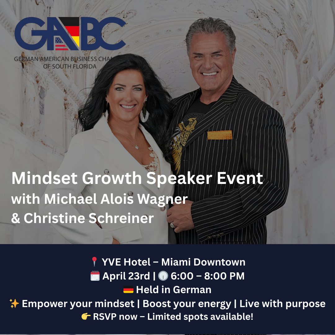 23rd April 2025 - Speaker Event with Michael Alis Wagner and Christine Schreiner from Austria about Mindset Growth at the Yve Hotel Miami Downton at 6.30pm to 8pm. Members 20$, Non-members 40$ RSVP here